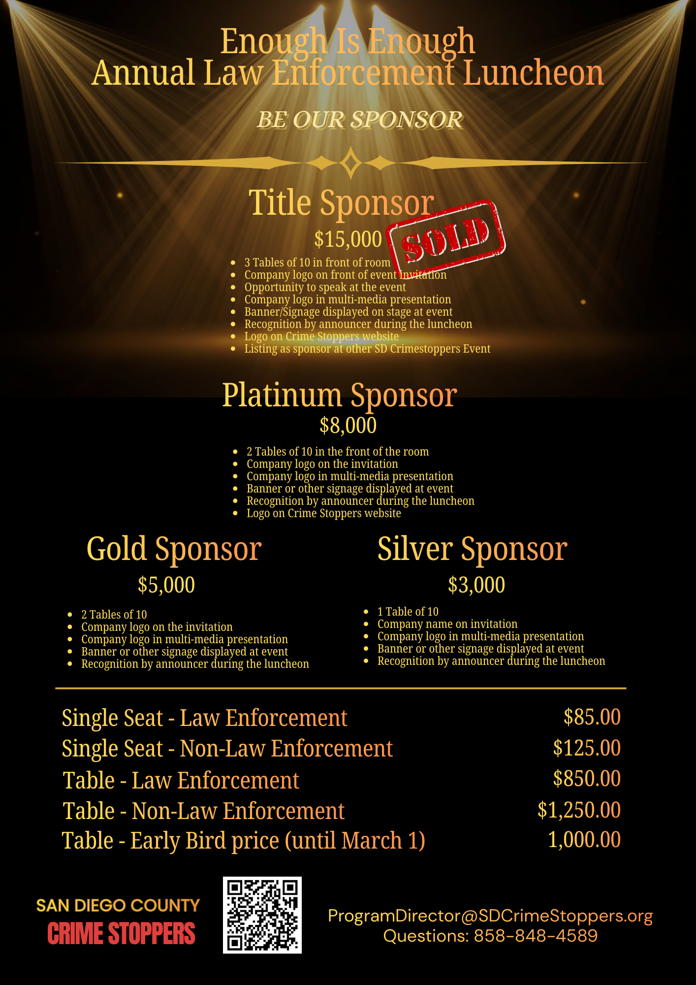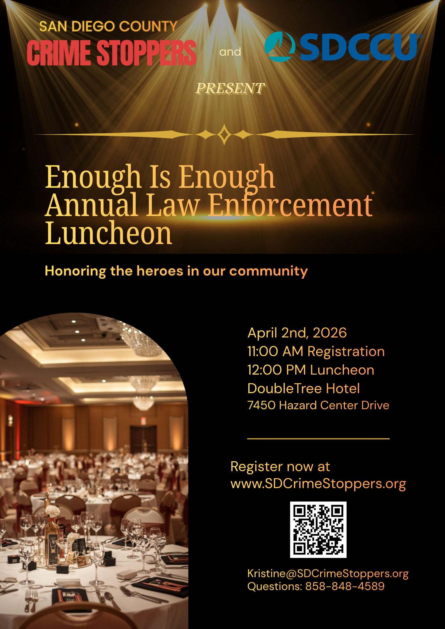 Join us for our annual fundraiser luncheon where you’ll have the opportunity to meet with members of local law enforcement and show your support for our mission to eliminate crime in San Diego. Your presence at this event will help us continue our efforts to make our community a safer place for all. We look forward to seeing you there!